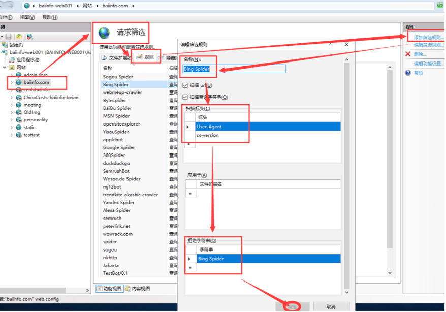 此例中的有来源中带有“Bing Spider”内容的访问请求都将被IIS所拒绝。
