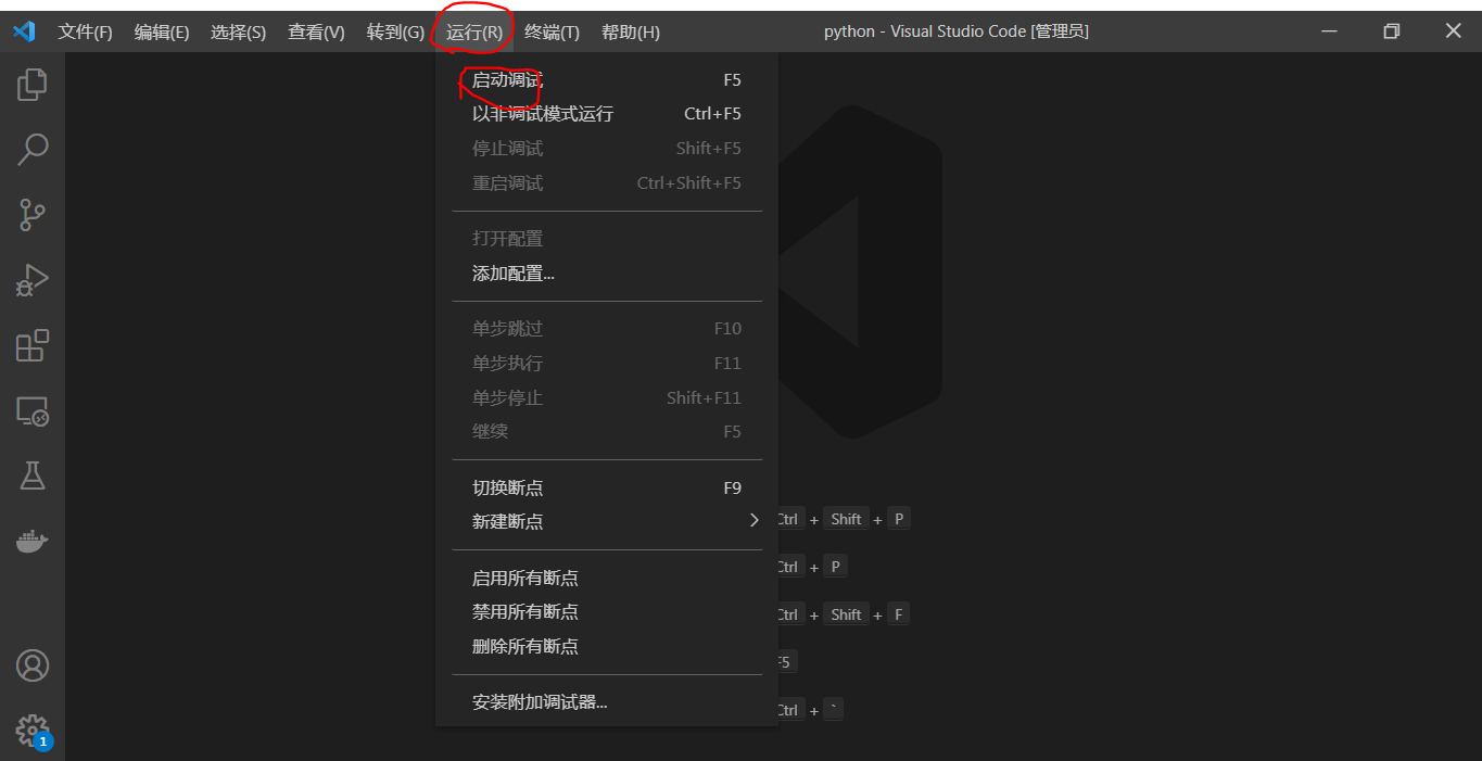 这里我们观察到,Python文件的后缀是".py",保存完成后,我们可以点击运行->启动调试来运行Python文件。