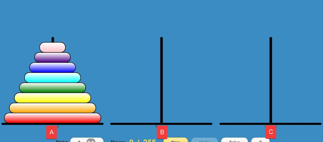 就是将图中A柱中的圆盘,通过B柱当辅助,一次移动一个,并且时刻保持大盘在上小盘在下,全部移动到C柱。
