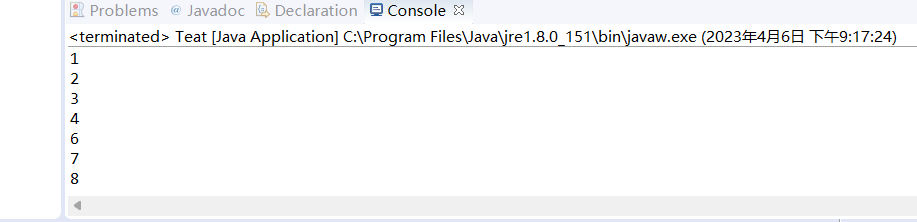 package shangjilianxi; public class Timu2 { public static void main(String[] args) { // TODO Auto-generated method stub int i=1; while(i<=8) { if(i!=5) System.out.println(i); i++; } } }![]()