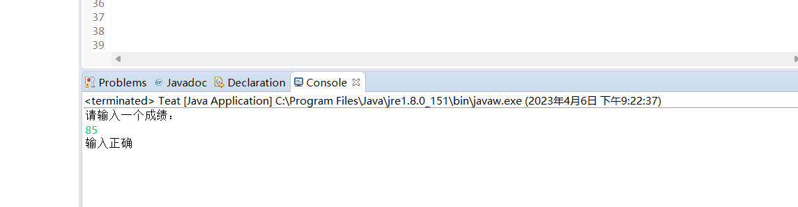 package diercizuoye; import java.util.Scanner; import org.omg.Messaging.SyncScopeHelper; public class Timua { public static void main(String[] args) { // TODO Auto-generated method stub Scanner input=new Scanner(System.in); System.out.println("请输入一个成绩:"); int grade=input.nextInt(); while (grade<0||grade>100) { System.out.println("输入错误,请重新输入"); grade=input.nextInt(); } System.out.println("输入正确"); } }![]()
