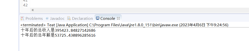 package diercizuoye; import java.util.Scanner; public class Timu5a { public static void main(String[] args) { // TODO Auto-generated method stub Scanner input=new Scanner(System.in); double x=30000; double sum=0; int year=10; double data=0.06; for (int i = 1; i <= year; i++) { sum+=x; x+=x*data; } System.out.println("十年后的总收入是"+sum); System.out.println("十年后的总年薪是"+x); } }![]()