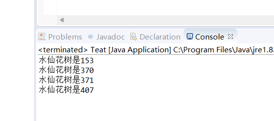 package diercizuoye; public class Timu10 { public static void main(String[] args) { // TODO Auto-generated method stub for (int i =100; i <=999; i++) { if((i/100)*(i/100)*(i/100)+(i%10)*(i%10)*(i%10)+(i/10%10)*(i/10%10)*(i/10%10)==i) System.out.println("水仙花树是"+i); } } }![]()