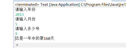 package diercizuoye; import java.util.Scanner; import java.util.concurrent.SynchronousQueue; public class Timu2a { public static void main(String[] args) { // TODO Auto-generated method stub Scanner input=new Scanner(System.in); int x=0; System.out.println("请输入年份"); int year=input.nextInt(); System.out.println("请输入月份"); int month=input.nextInt(); System.out.println("请输入多少号"); int day=input.nextInt(); if (year/4==0&&year/100!=0||year%400==0) { x=1; } int monthday=0; int dayday=0; for (int i = 1; i <=month; i++) { switch(i) { case 1: case 3: case 5: case 7: case 8: case 10: case 12: monthday=31; break; case 4: case 6: case 11: monthday=30; break; case 2: if(x==1) monthday=29; else if(x==0) monthday=28; break; } dayday+=monthday; } dayday+=day; System.out.println("这是一年中的第"+dayday+"天"); } }![]()