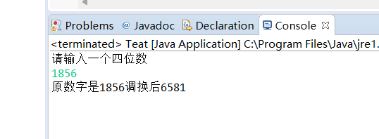 package diercizuoye; import java.util.Scanner; public class Timu11 { public static void main(String[] args) { // TODO Auto-generated method stub Scanner input=new Scanner(System.in); System.out.println("请输入一个四位数"); int a=input.nextInt(); int qian=a/1000; int bai=a/100%10; int shi=a/10%10; int ge=a%10; System.out.println("原数字是"+a+"调换后"+(ge*1000+shi*100+bai*10+qian)); } }![]()