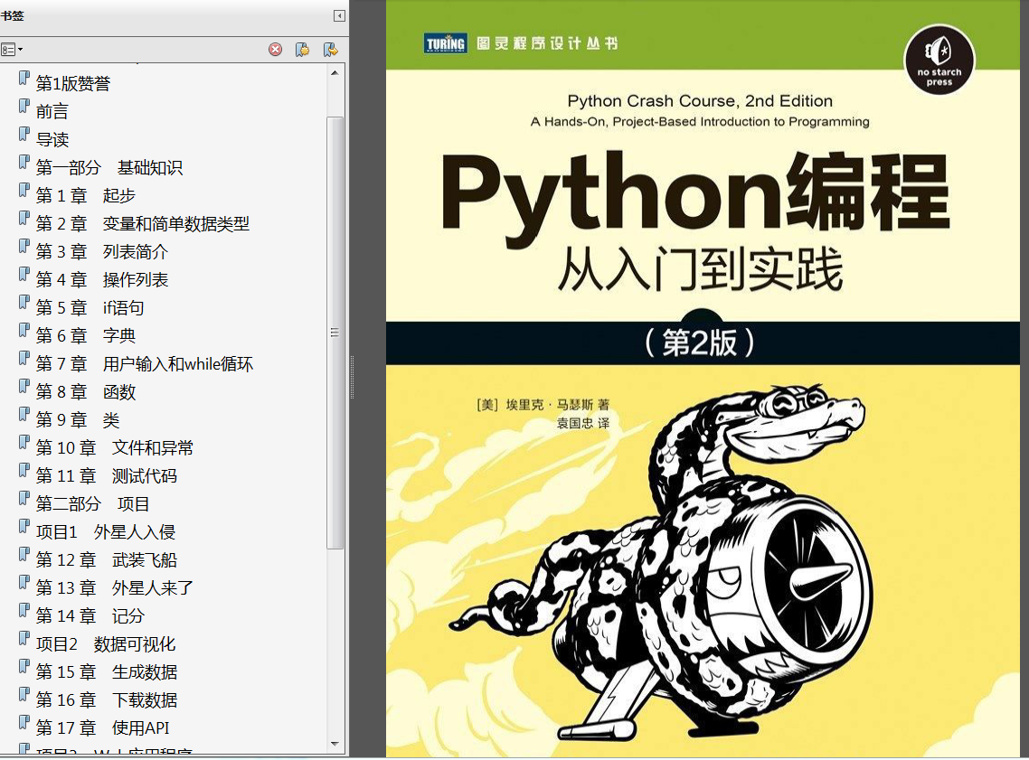 《Python编程从入门到实践第2版》中文PDF,730页,有详细书签目录,文字可以复制;《Python编程从入门到实践第2版》英文PDF,548页,有详细书签目录,文字可以复制;配套源代码、练习答案;埃里克马瑟斯;袁国忠译