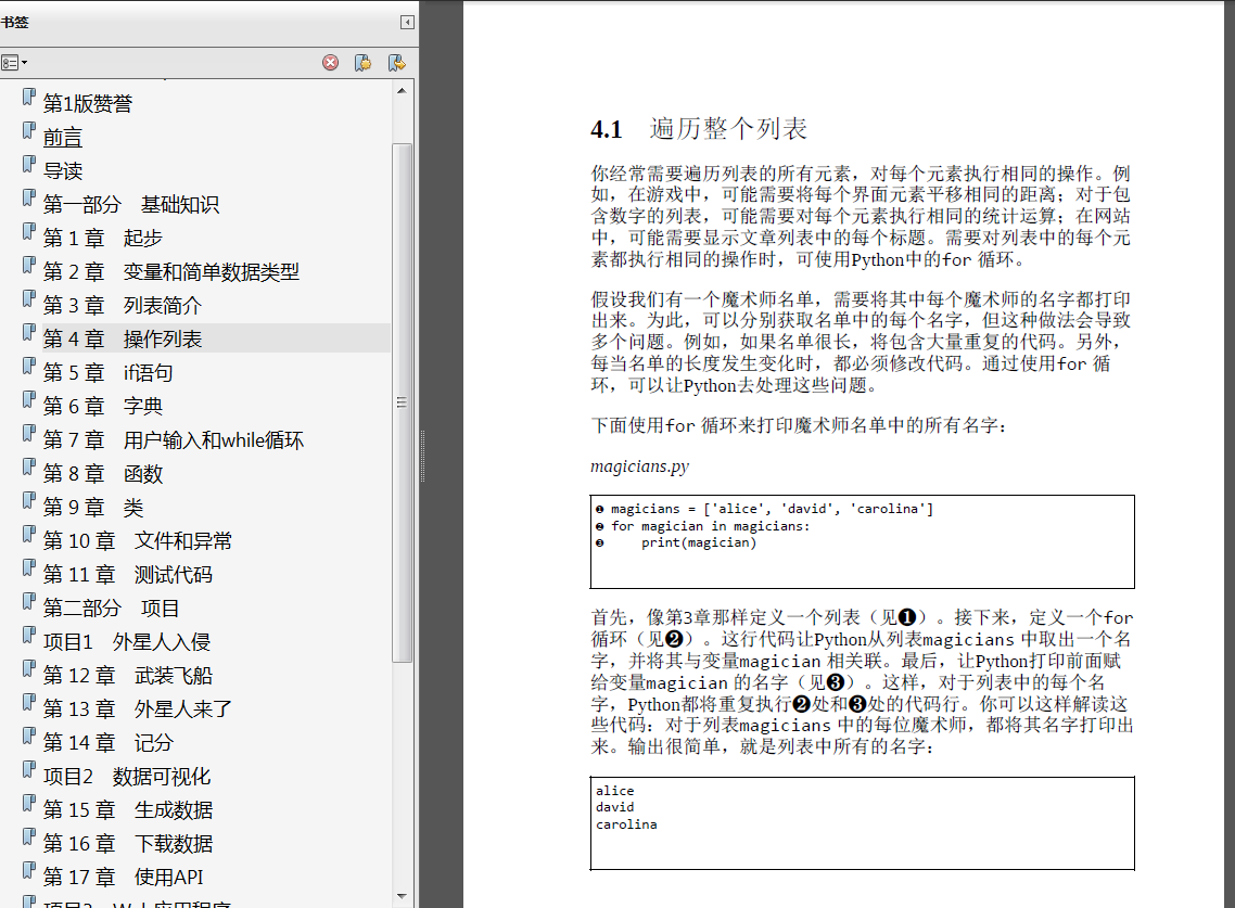 程序时需要熟悉的基本编程概念,刚接触几乎任何编程语言时都需要学习这些概念。学习各种数据以及在程序中将数据存储到列表和字典中的方式。学习如何创建数据集以及如何高效地遍历它们。将学习使用