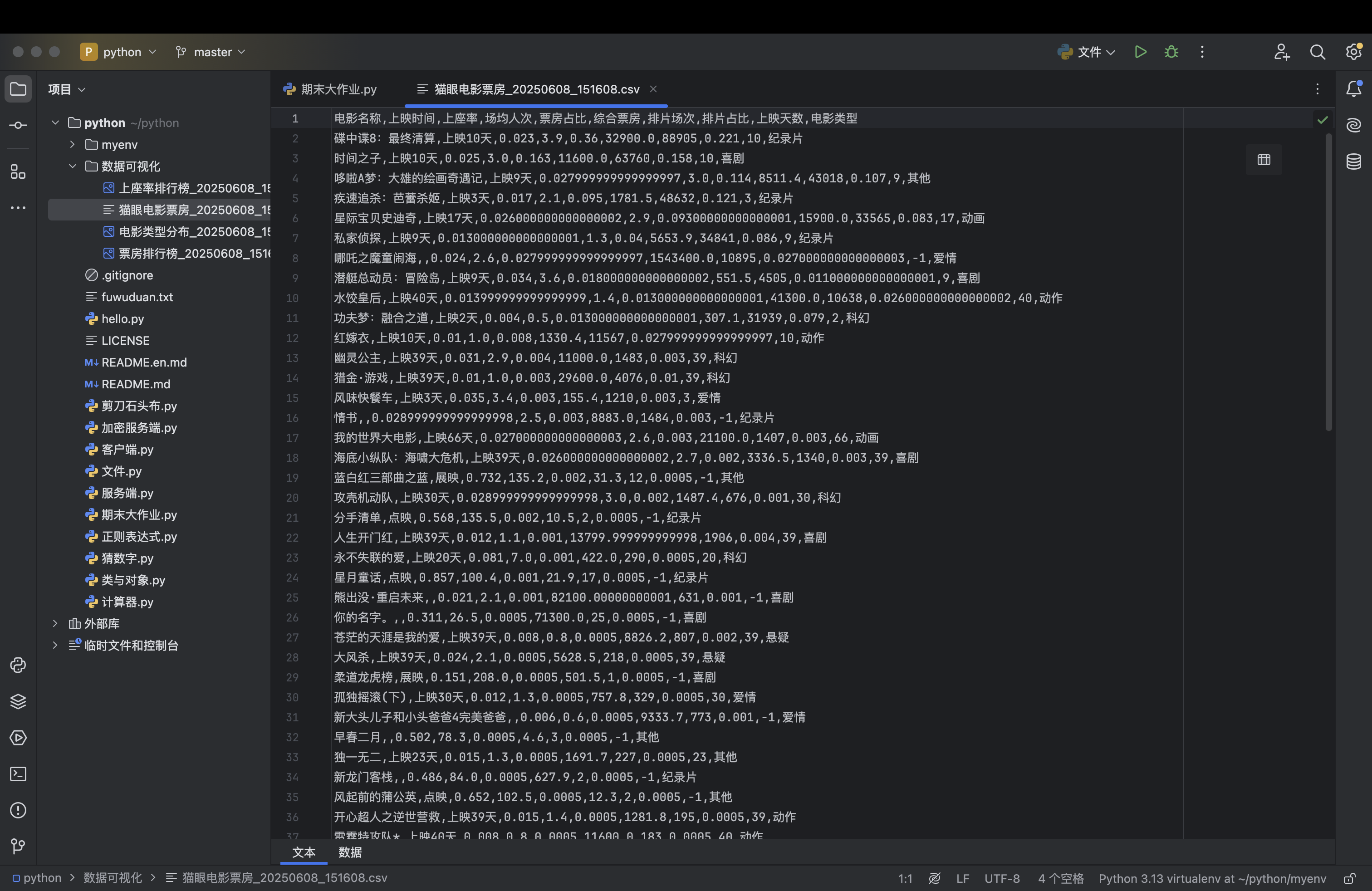 3.数据分析:对处理后的数据进行多维度分析,如票房分布、不同类型电影的票房表现等。