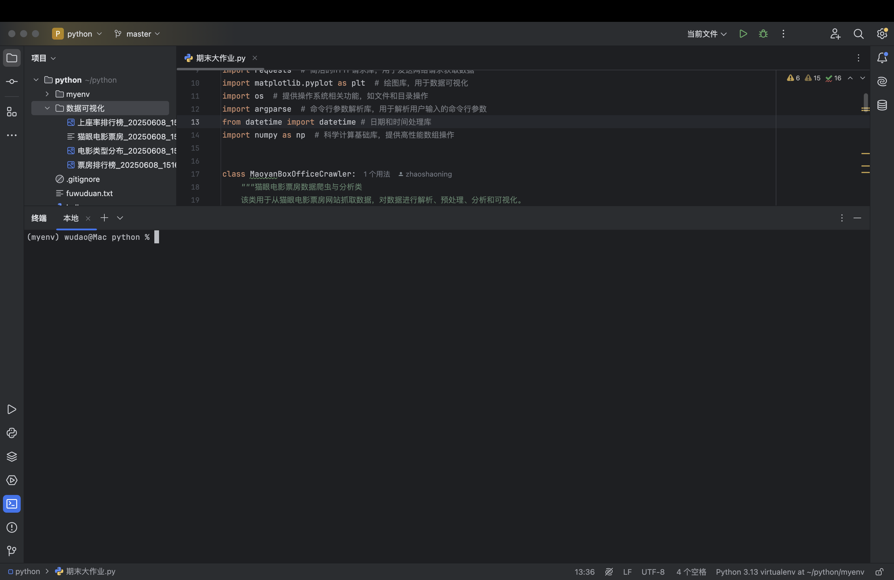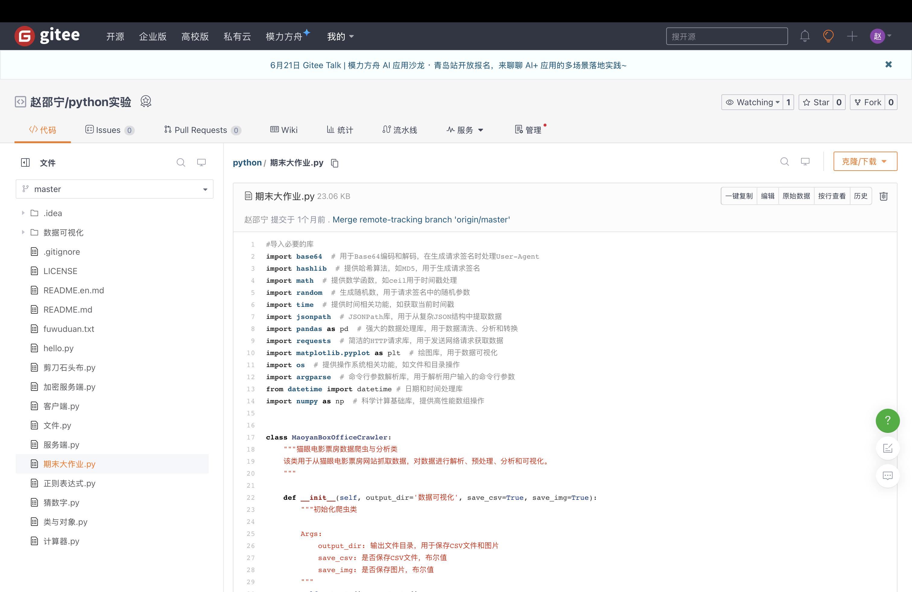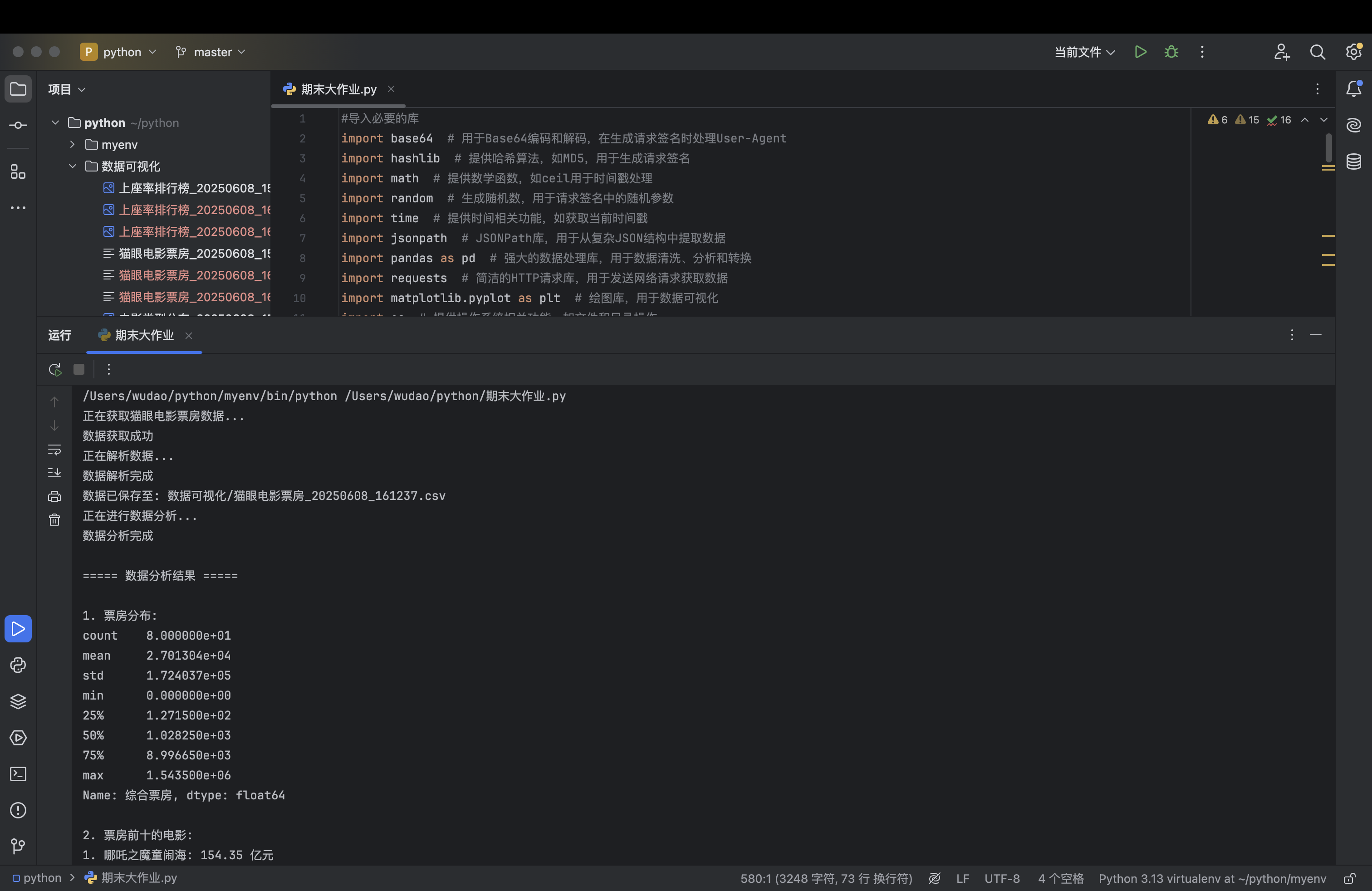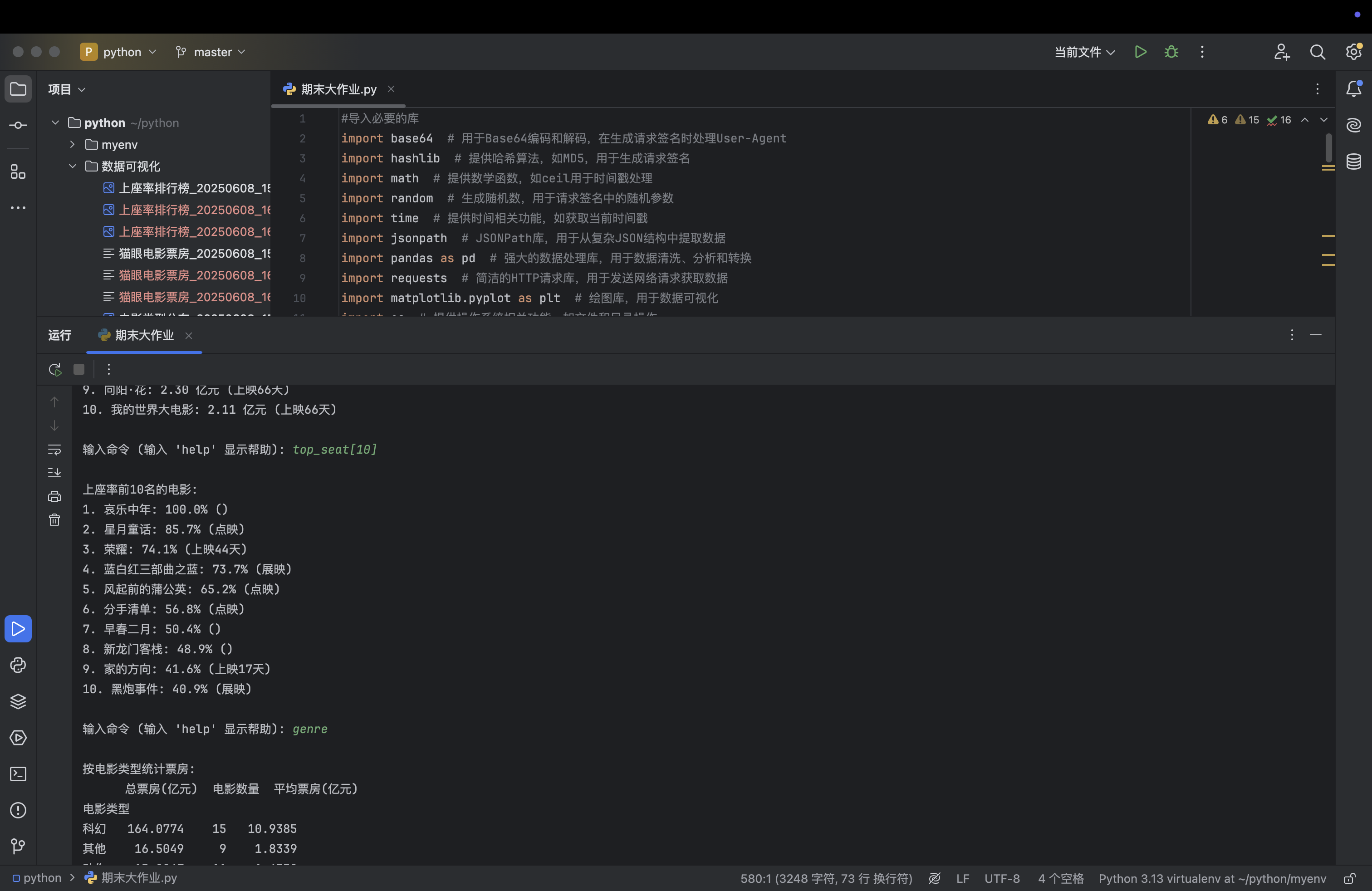 实验四的大作业想了很久不知道要做什么程序,最后还是决定做一个爬虫程序。Python爬虫技术是Python里最重要的部分之一,在今天这样数据和信息爆炸的时代,爬虫可以帮助我们很有效地处理数据和信息。老师上课讲到爬虫时带我们写了一个简单的爬取豆瓣电影的程序,再加上我有时候想想了解最新上映的电影但是又有点懒得点开看,于是我就写了这个程序。它可以帮助我直观地看到猫眼上还在上映的电影的票房数据等,帮助我决策要不要去看某部电影。第一次编写这么复杂的程序,花费了很多时间和精力,中间PyCharm报了无数错误(点击运行满屏红色的救赎感),不断的查找相关视频资料和询问AI,但最终运行成功的时候真的成就感满满。这次实验过程也极大的提高了我的编程能力,编写程序的过程也是一个不断探索的过程,我对编程的兴趣也多了很多。