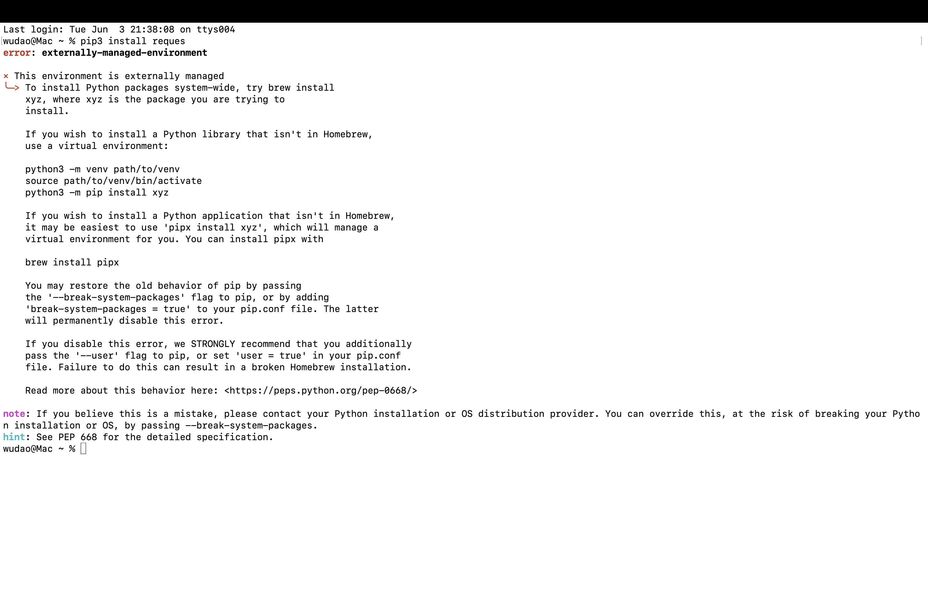 询问AI后得知由于MacBook 使用 Homebrew 或系统自带的 Python,这类 Python 环境不允许用户随意安装第三方库,防止破坏系统依赖,所以需要使用虚拟环境在其中安装库。