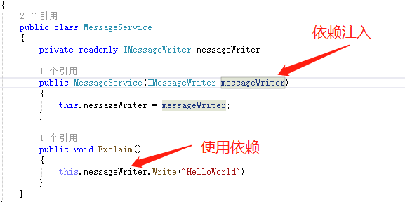 1 public class MessageService : IMessageService 2 { 3 private readonly IMessageWriter messageWriter; 4 5 public MessageService(IMessageWriter messageWriter) 6 { 7 this.messageWriter = messageWriter; 8 } 9 10 public void Exclaim() 11 { 12 this.messageWriter.Write("HelloWorld"); 13 } 14 }