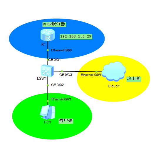 原理:让攻击者hacker在局域网内释放大量的discovery包来瘫痪真正的DHCP服务器,让PC1不能正常获取IP