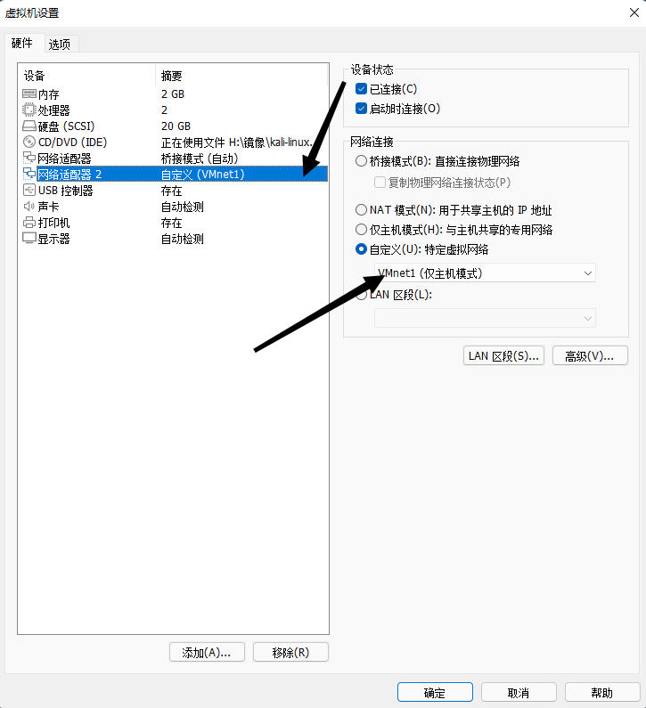 为kali linux也添加一张网卡,桥接到VMnet1中,做之前先打开kali linux下载相应的包,要不然桥接后连不上网是无法进行下载的