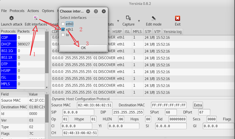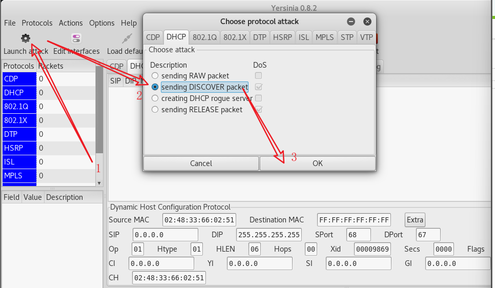 我们这里使用yersinia工具来进行攻击
