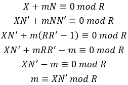 由如下推导可知,要使得X+m*N≡0 mod R,只要取m≡X*N' mod R即可,这样就求出了使X+m*N能被R整除的m。