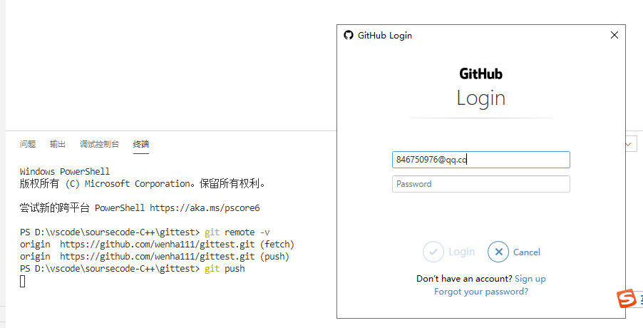 然后,我们就该考虑我们怎么把本地Repository中的修改提交到远程Repository中,就要用到git push命令了,提交时需要验证邮箱和密码。