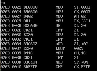 assume cs:code, ds:datadata segmentx db 1, 9, 3len1 equ $ - x ; 符号常量, $指下一个数据项的偏移地址,这个示例中,是3y dw 1, 9, 3len2 equ $ - y ; 符号常量, $指下一个数据项的偏移地址,这个示例中,是9data endscode segmentstart:mov ax, datamov ds, axmov si, offset x ; 取符号x对应的偏移地址0 -> simov cx, len1 ; 从符号x开始的连续字节数据项个数 -> cxmov ah, 2s1:mov dl, [si]or dl, 30hint 21hmov dl, ' 'int 21h ; 输出空格inc siloop s1mov ah, 2mov dl, 0ahint 21h ; 换行mov si, offset y ; 取符号y对应的偏移地址3 -> simov cx, len2/2 ; 从符号y开始的连续字数据项个数 -> cxmov ah, 2s2:mov dx, [si]or dl, 30hint 21hmov dl, ' 'int 21h ; 输出空格add si, 2loop s2mov ah, 4chint 21hcode endsend start |
