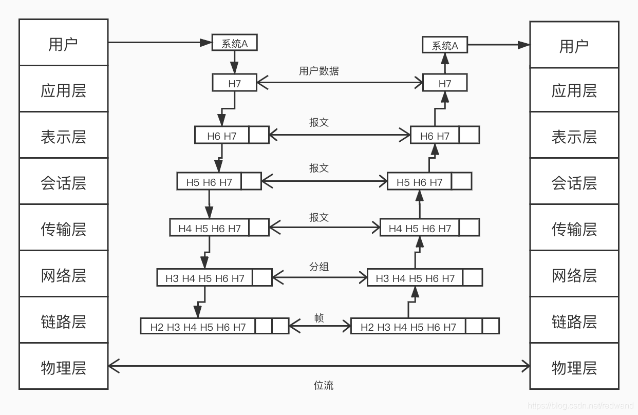 物理层:物理接口规范,传输比特流,网卡是工作在物理层的。二进制传输,传输单位(比特 Bit)