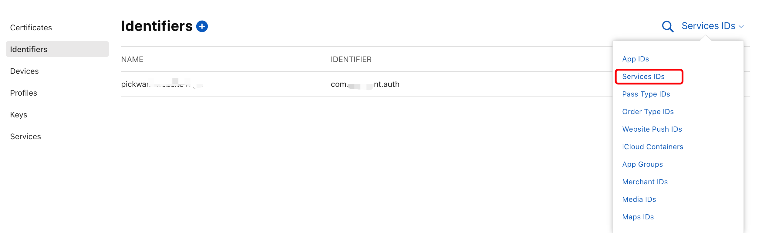 1.在左侧选择【Identifiers】,点击 + 创建一个新的 Service ID。