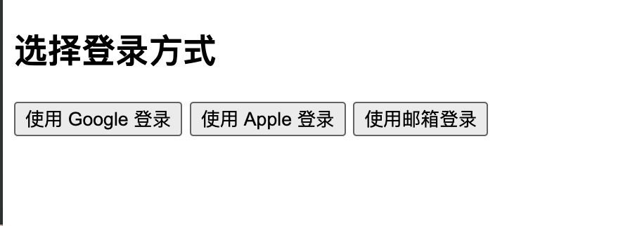 <!DOCTYPE html> <html lang="en"> <head> <meta charset="UTF-8"> <title>Auth0 多方式登录</title> </head> <body> <h2>选择登录方式</h2> <button onclick="loginWithProvider('google-oauth2')">使用 Google 登录</button> <button onclick="loginWithProvider('apple')">使用 Apple 登录</button> <button onclick="loginWithProvider()">使用邮箱登录</button> <!-- 👈 不指定 provider --> <script> function loginWithProvider(provider) { const domain = "dxxxxxsvtpkwfz0rls6yh.us.auth0.com"; const clientId = "kxxxxf35J5lKbbJHIEAL8lJmWQlvhJe"; const redirectUri = encodeURIComponent("http://localhost:3000/login/callback"); const scope = "openid email profile"; let connectionParam = ""; if (provider) { connectionParam = `&connection=${provider}`; } const auth0Url = `https://${domain}/authorize` + `?response_type=code` + `&client_id=${clientId}` + `&redirect_uri=${redirectUri}` + `&scope=${scope}` + connectionParam + `&state=${provider || 'email'}`; window.location.href = auth0Url; } </script> </body> </html>