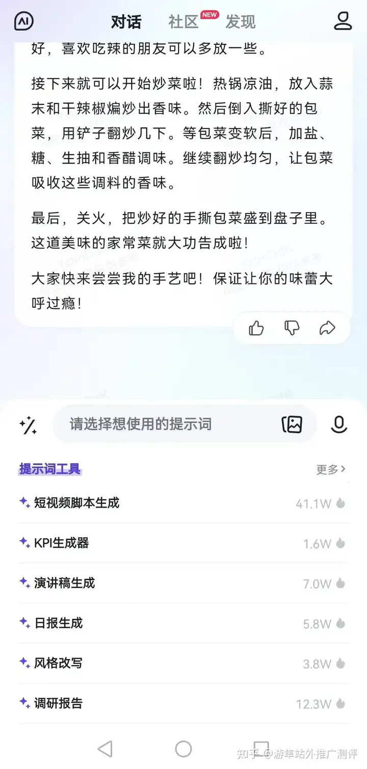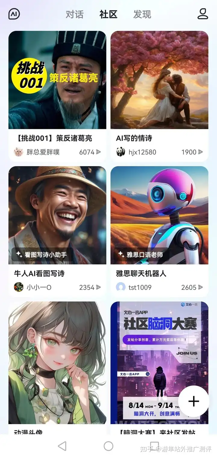 相比于其它对话式APP,文心一言APP最大的亮点,是有社区和发现两个模块。即便是之前没接触过AI对话应用的朋友,也能通过看别人分享的对话,快速上手。