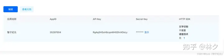 - 创建成功以后,平台会分配相关的凭证,包括AppID、API Key、Secret Key,以上三个信息是您应用实际开发的主要凭证,每个应用之间各不相同,请妥善保管: