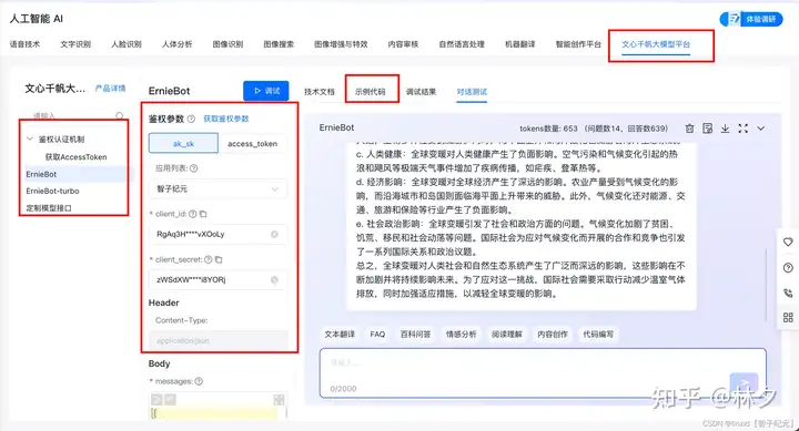 - 模型调试平台,在这个平台我们可以调试不同的模型和示例代码:https://console.bce.baidu.com/tools/#/api?product=AI&project=文心千帆大模型平台&parent=鉴权认证机制&api=oauth%2F2.0%2Ftoken&method=post