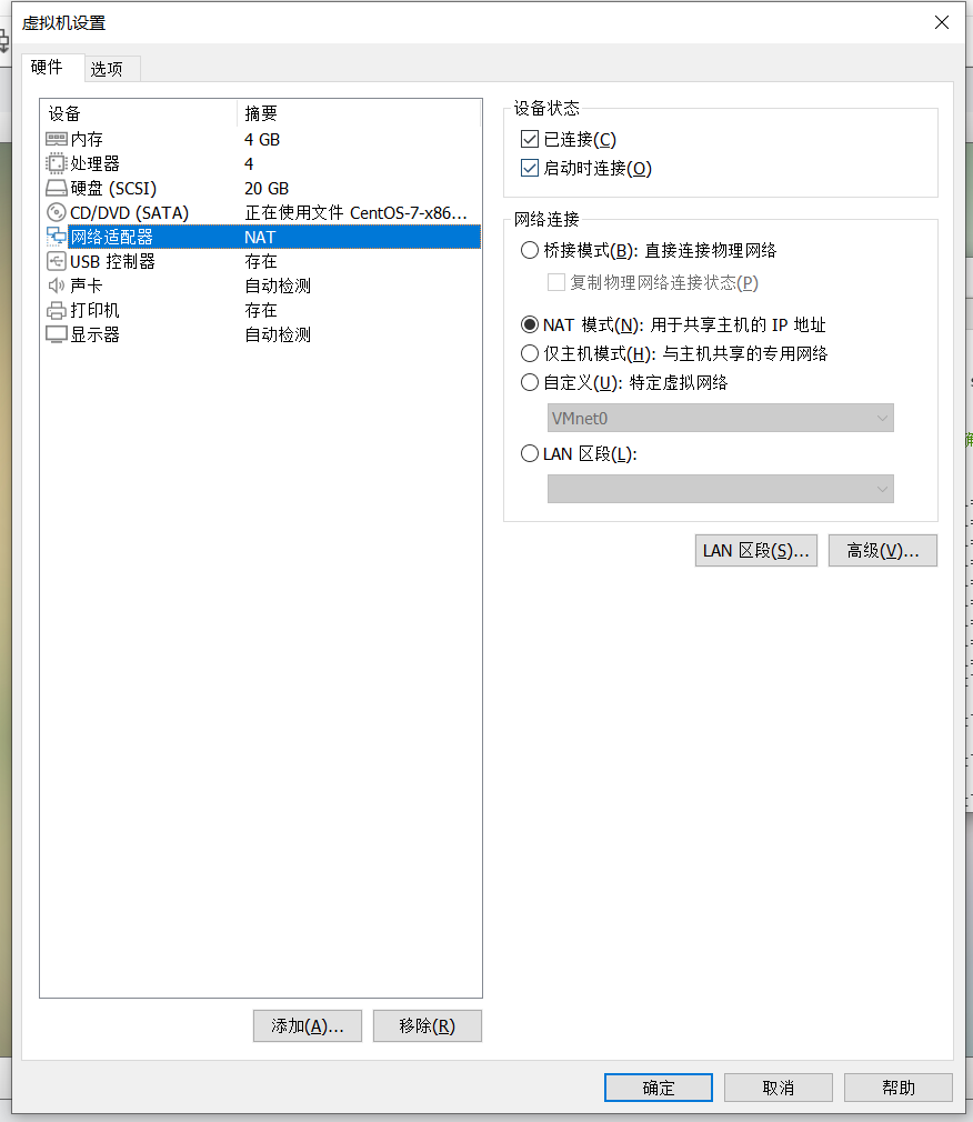 第一步设置网络适配器,将网络连接模式设置NAT模式;