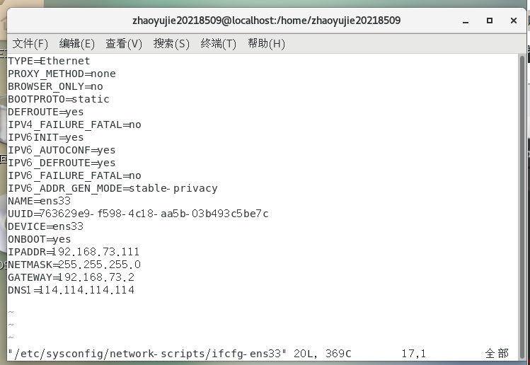 第三步 进入虚拟机配置文件:vim /etc/sysconfig/network-scripts/ifcfg-ens33,设置虚拟机ip相关信息