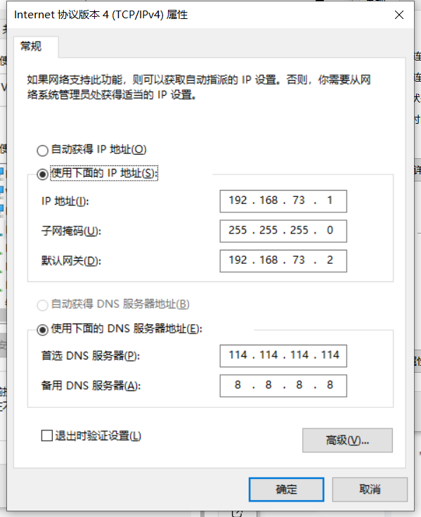 IP地址设置为192.168.73.1 ;前三位和vmnet8网段一样,最后一位随意设置,没被占用即可子网掩码设置为255.255.255.0 和vmnet8一样