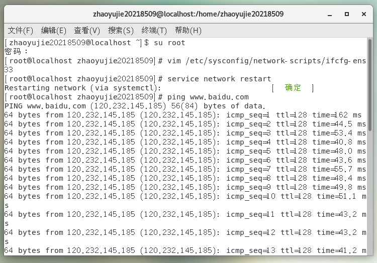 第六步 测试 虚拟机ping百度:ping www.baidu.com