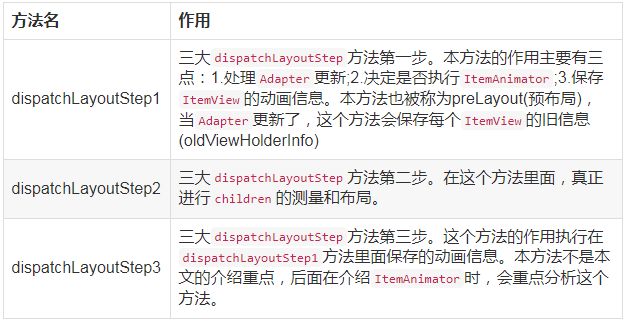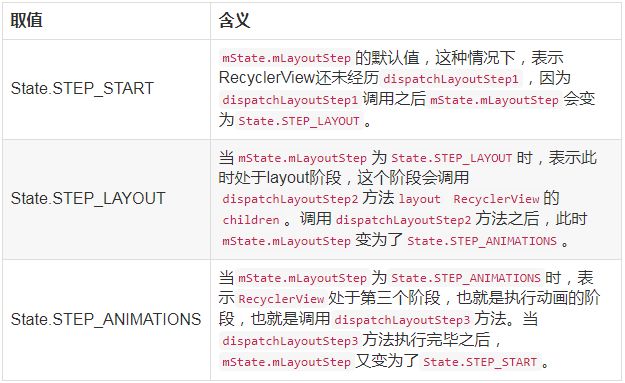 从上表中,我们了解到mState.mLayoutStep的三个状态对应着不同的dispatchLayoutStep方法。这一点,我们必须清楚,否则接下来的代码将难以理解。