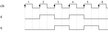 2. 时钟上升沿时,将d的值赋给q。即先有上升沿,才有信号变化。