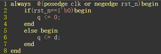 1····总是(always)在时钟(clk)上升沿(posedge)的时候或者下降沿(negedge)复位(rst_n)的时候执行2~8的代码,如果不满足则q的值不变。