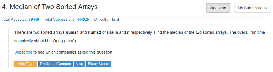 首先来看Leetcode上一道评级为Hard级别的题目。例如以下。两个有序数组,求它们合并后的中位数。这当然没啥难的。你可能会想到合并后用一个quicksort()。然后取中间位置。结果上当然能够得到正确答案。可是一定要注意:题目要求算法时间复杂度是O(log(t)),t是合并后数组的长度。可是,quicksort()的复杂度应该是O(t·log(t))。显然这样做行不通。满足时间复杂度要求才是本题的难点!