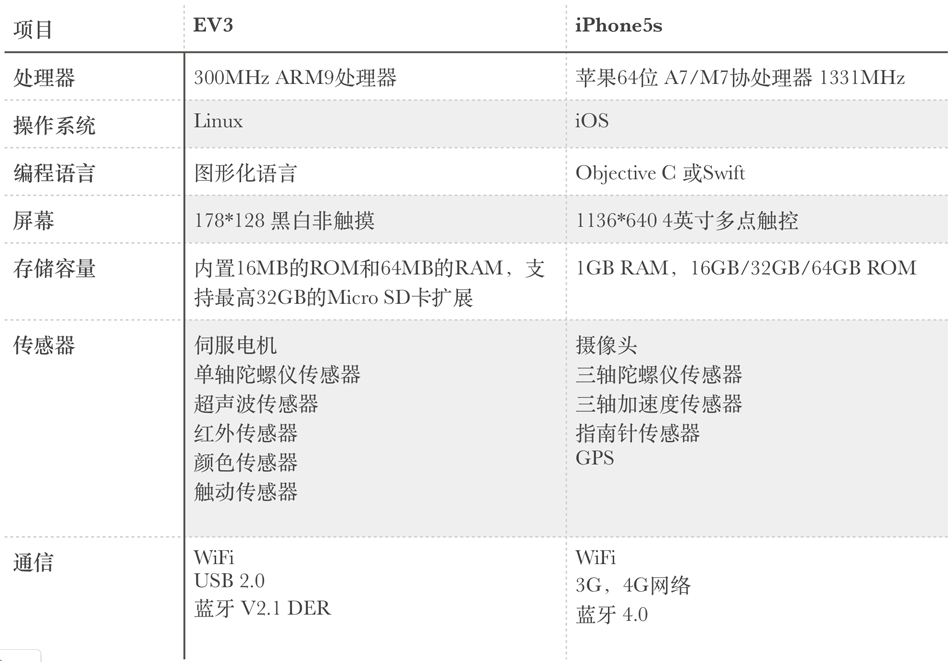 从上面的表格对照中我们能够看到 除了EV3支持非常多iPhone不具备的传感器之外。在其它方面,EV3全然和iPhone5S不是在一个数量级!