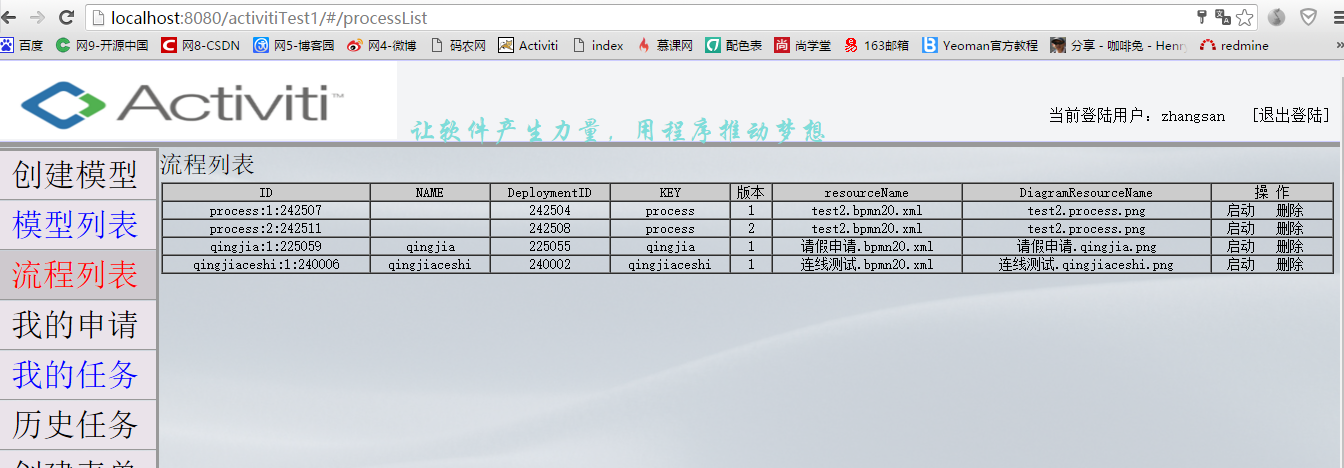 流程定义部署之后,自然就是流程定义列表了,但和前一节一样的是,这里也是和之前单独的activiti没什么差别。因此也不多说。我们先看看列表页面以及相应的代码,然后在一步步说明点击启动button时怎样调用自己定义的form表单。
