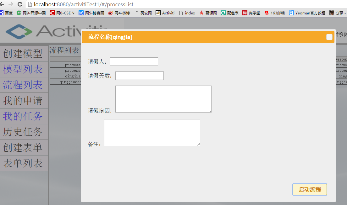 在上边的代码中就有须要注意的地方了,从代码中能够看到。当我们点击页面的启动button时,会触发toProcess方法。而这种方法就使用到了dialog对话框。对话框中显示的内容便是之前自己定义的表单,从后台数据库中请求过来。