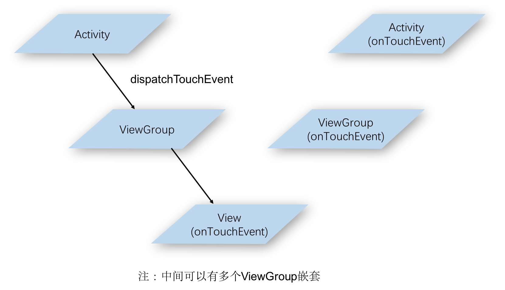 ViewGroup拿到点击事件后,首先会调用onInterceptTouchEvent()方法来推断是否须要拦截该事件,防止该事件继续传递到子View。假设须要拦截该事件,则返回true,调用本身的onTouchEvent()方法处理该事件。假设不须要拦截该事件,调用子View的dispatchTouchEvent()方法,将事件传递给子View。假设存在多层ViewGroup嵌套。事件的传递过程也是相同的。