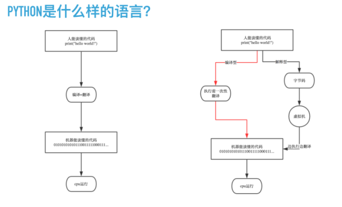 一个用编译性语言比如C或C++写的程序可以从源文件(即C或C++语言)转换到一个你的计算机使用的语言(二进制代码,即0和1)。这个过程通过编译器和不同的标记、选项完成。当你运行你的程序的时候,连接/转载器软件把你的程序从硬盘复制到内存中并且运行。而Python语言写的程序不需要编译成二进制代码。你可以直接从源代码运行程序。在计算机内部,Python解释器把源代码转换成称为字节码的中间形式,然后再把它翻译成计算机使用的机器语言并运行。事实上,由于你不再需要担心如何编译程序,如何确保连接转载正确的库等等,所有这一切使得使用Python更加简单。由于你只需要把你的Python程序拷贝到另外一台计算机上,它就可以工作了,这也使得你的Python程序更加易于移植