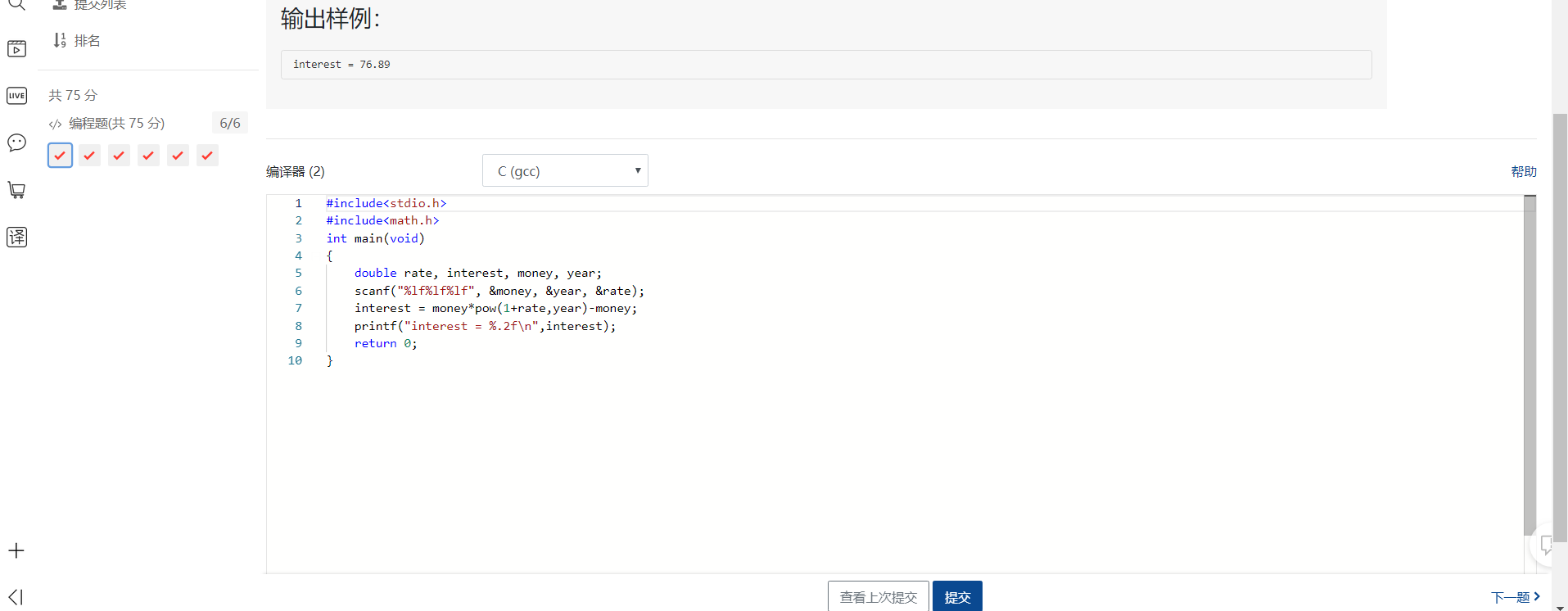 题目内容描述:本题目要求计算存款利息,计算公式为interest=money×(1+rate)year −money,其中interest为存款到期时的利息(税前),money是存款金额,year是存期,rate是年利率