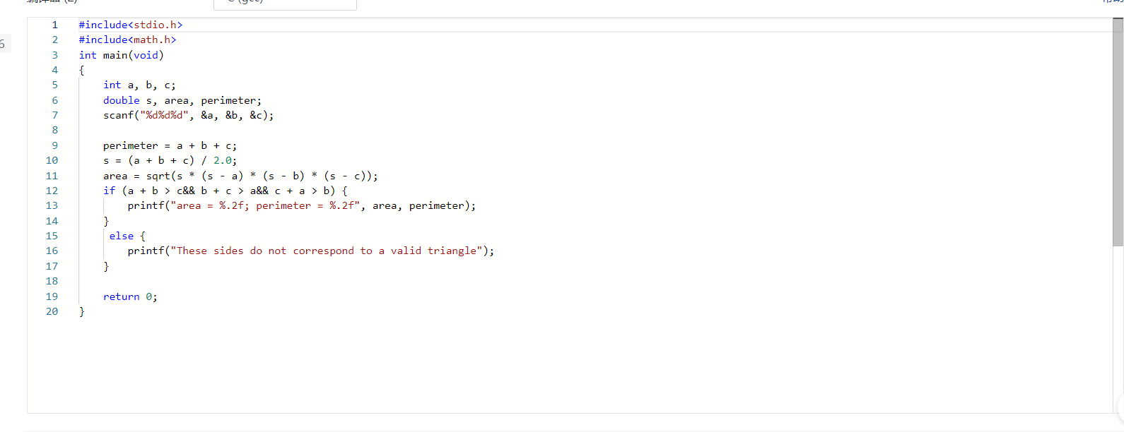 题目内容描述:本题要求编写程序,根据输入的三角形的三条边a、b、c,计算并输出面积和周长。注意:在一个三角形中, 任意两边之和大于第三边。三角形面积计算公式:area=√s(s−a)(s−b)(s−c) ,其中s=(a+b+c)/2。