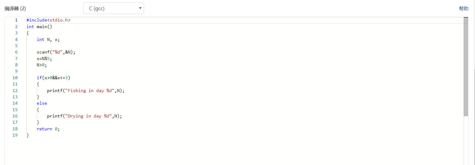 题目内容描述:中国有句俗语叫“三天打鱼两天晒网”。假设某人从某天起,开始“三天打鱼两天晒网”,问这个人在以后的第N天中是“打鱼”还是“晒网”?