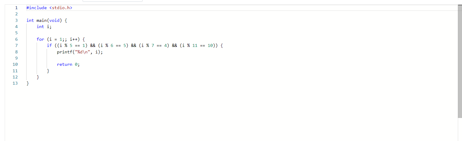 - if ((i % 5 == 1) && (i % 6 == 5) && (i % 7 == 4) && (i % 11 == 10))开始没有吧里面的条件全部括起来