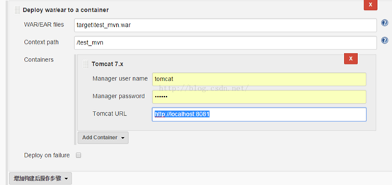 Containers: tomcat7。当然你要有manager用户信息。在tomcat目录下的conf目录,tomcat-users.xml修改如下: