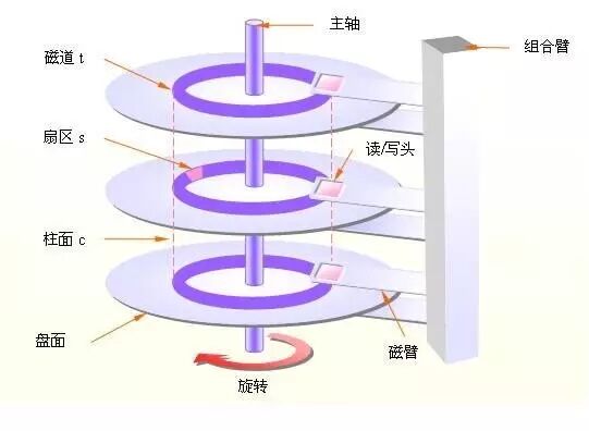 最后每个盘片上都有可以读写数据的磁头。所以,如果你想访问我的数据,可以说: 把0柱面, 0磁头, 1扇区的数据给我拿来。