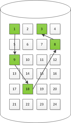 内存坏笑了一下又说: 不喜欢也没关系嘛,试试采用链式啊:这个文件从第一块磁盘开始,形成一个链 1->9->18->8->3 , 每一块空闲的磁盘都会得到充分的利用, 效率非常高。