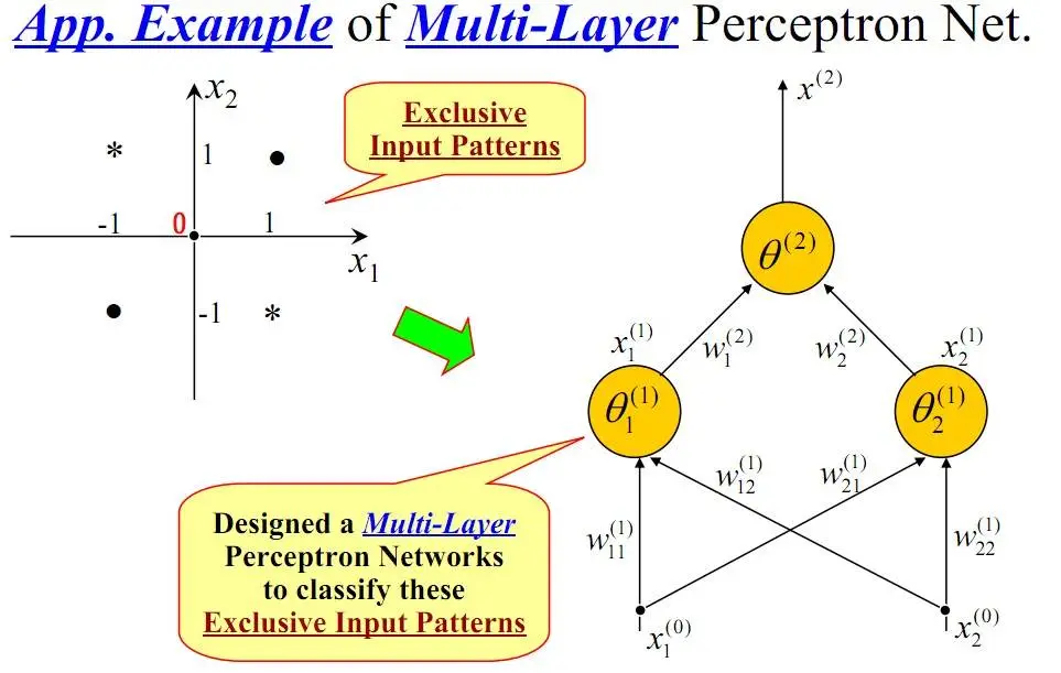 既然单层感知机解决不了非线性问题,那我们就采用多层感知机,下图就是一个两层感知机解决异或问题的示意图: