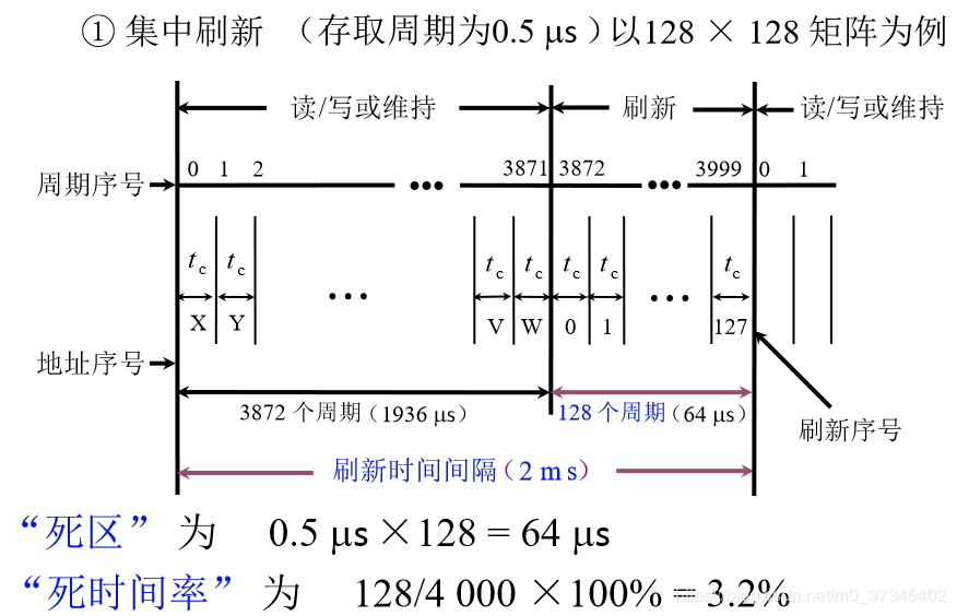 用0.5μs*128=64μs的时间对128行进行逐行刷新,由于这64μs的时间不能进行读/写操作,故称为“死时间”或访存“死区”。