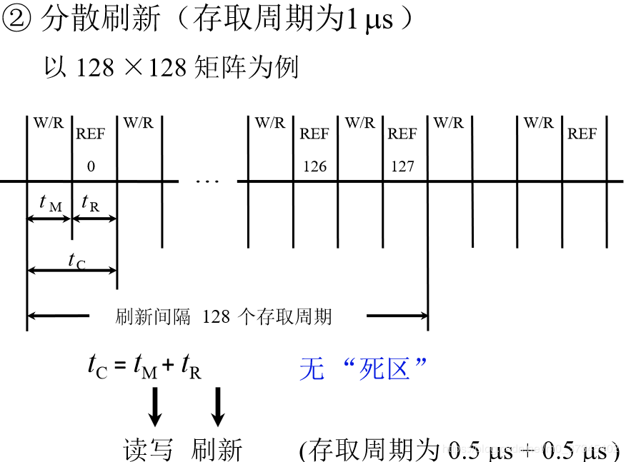 即在每个存取操作后绑定一个刷新操作。延长了存取周期,这样存取周期就成了0.5μs + 0.5μs =1μs。但是由于与存取操作绑定,就不需要专门给出一段时间来刷新了。这样,每有128个读取操作,就会把0-127行全部刷新一遍。故每隔128μs 就可将存储芯片全部刷新一遍,即刷新周期是1μs×128=128μs远短于2ms,而且不存在停止读/写的死时间,但是存取周期长了,整个系统速度降低了。(分散刷新的刷新周期128μs ,其实不需要这么频繁,会导致浪费)